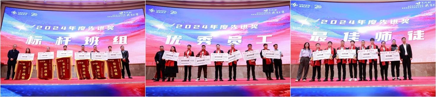 随后,2024 年度先进表彰环节正式拉开帷幕。“最佳师徒”、“优秀员工”、“标杆班组”、“优秀骨干”、“优秀经理人” 以及 “创新突破事件/团队” 等多个奖项一一揭晓。获奖者们凭借2024年突出业绩和价值贡献,赢得了各项先进荣誉,他们走上领奖台,手捧奖杯和锦旗成为全场瞩目的焦点,也为全体员工树立了学习的榜样。